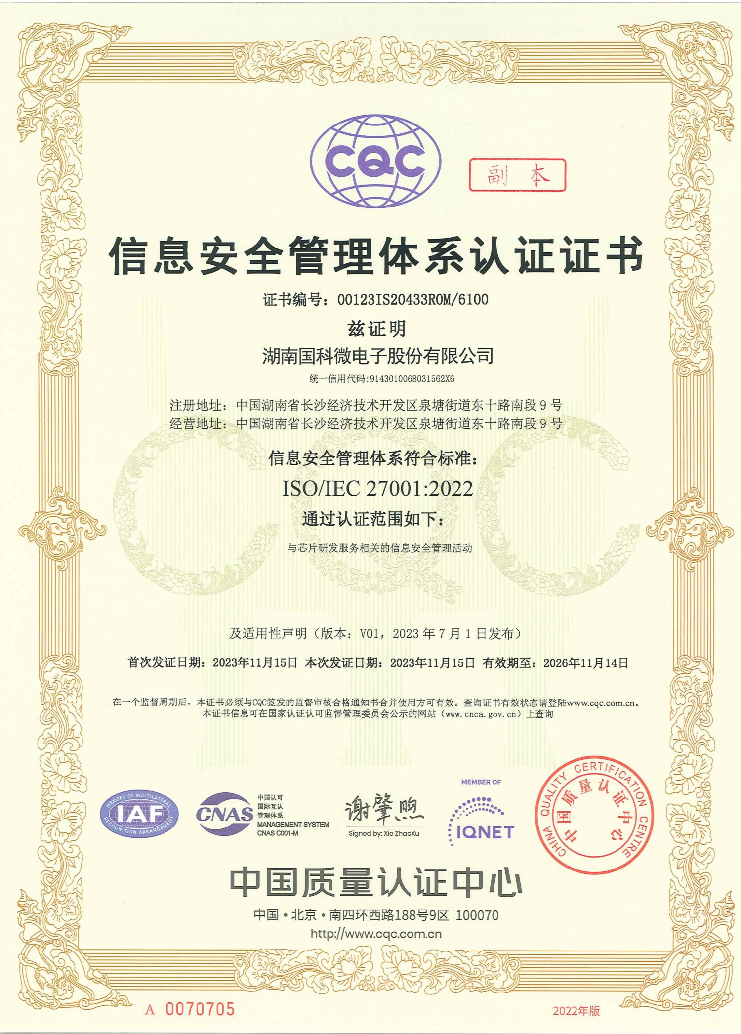 信息安全管理体系认证证书
